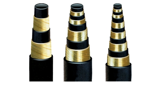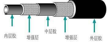 主要由內膠層、中膠層、2、4、6層鋼絲纏繞層、外膠層組成。內膠層具有使輸送介質承受壓力,保護鋼絲不受侵蝕的作用,外膠層保護鋼絲不受損傷,高壓膠管鋼絲(ф0.3-2.0增強層)層是骨架材料起增強作用。